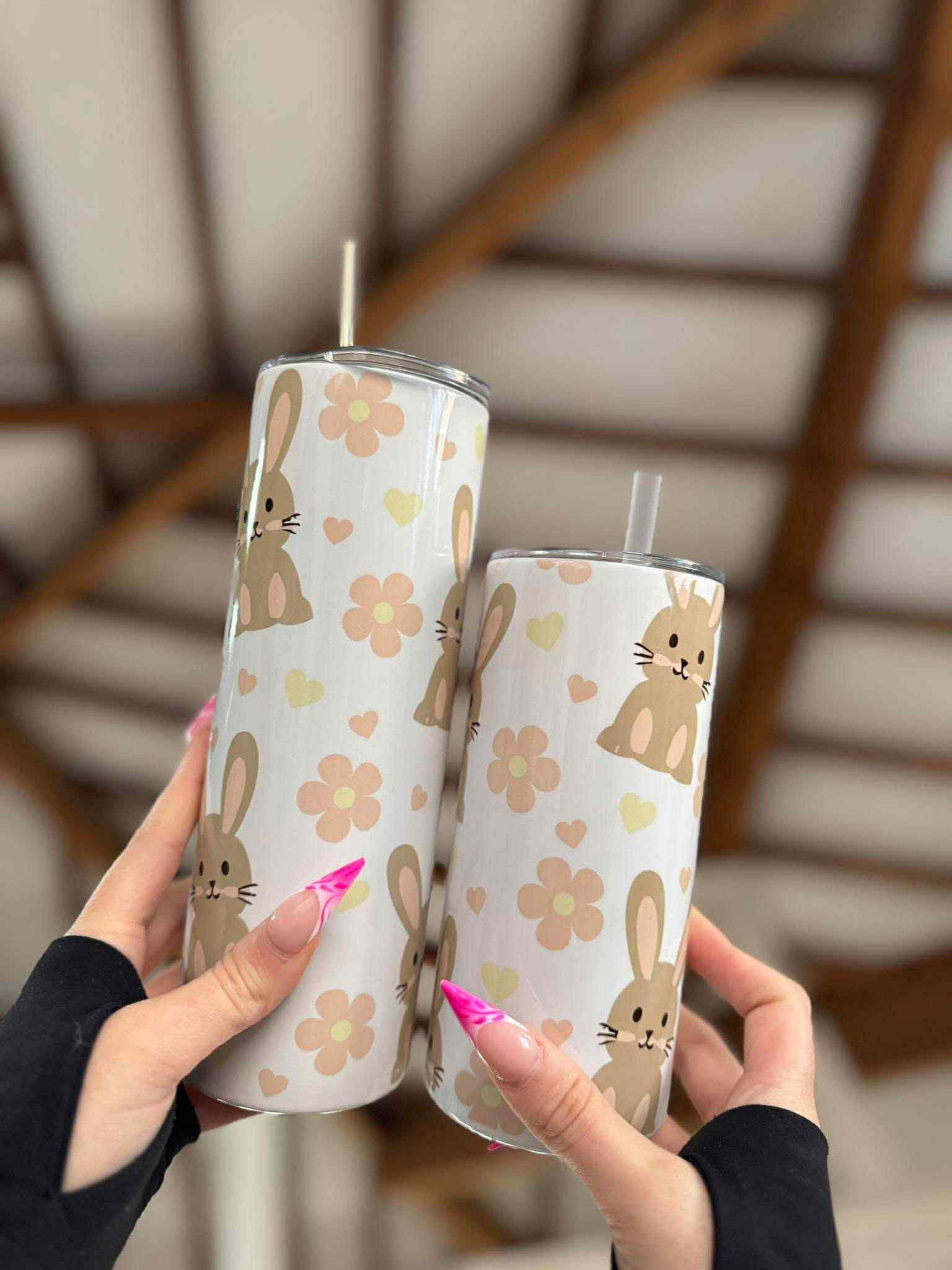 Cute, cuddly, and full of springtime vibes! This set features a 20oz and 15oz tumbler adorned with a beige bunny rabbit and delicate flowers—perfect for coffee, tea, or any drink while adding a touch of whimsy to your day.
