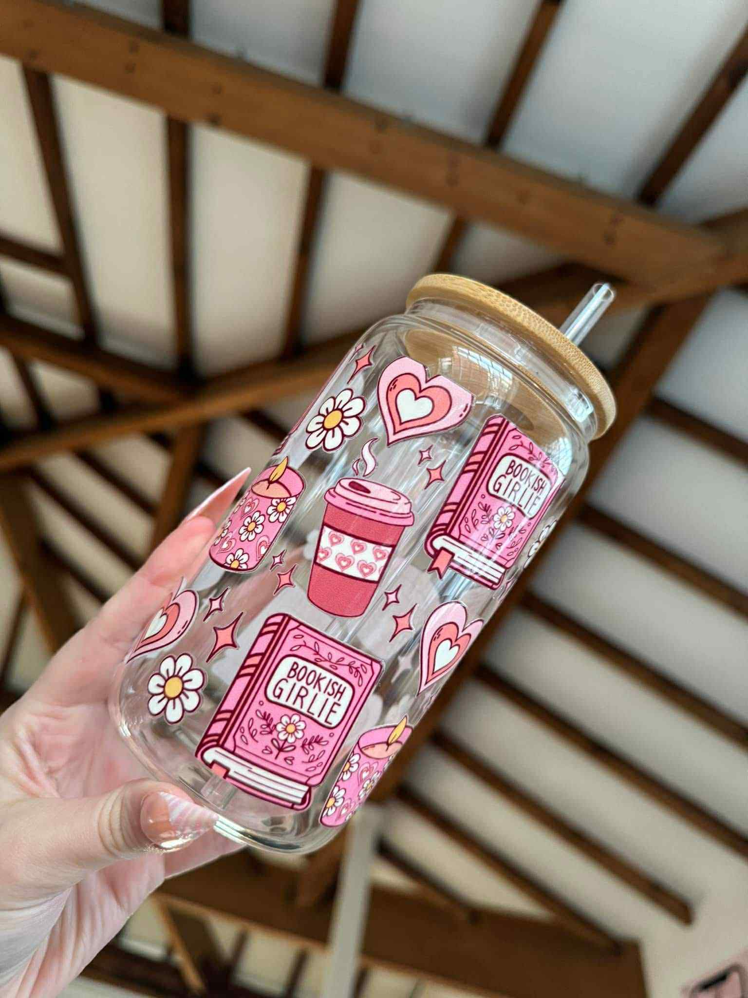 Bookish Girlie 15oz Libbey Glass Can – Sip, read, repeat! This 15oz Libbey glass can comes with a bamboo lid and straw, perfect for cozy reading sessions while channeling all the cute, book-loving vibes. 📚💖✨