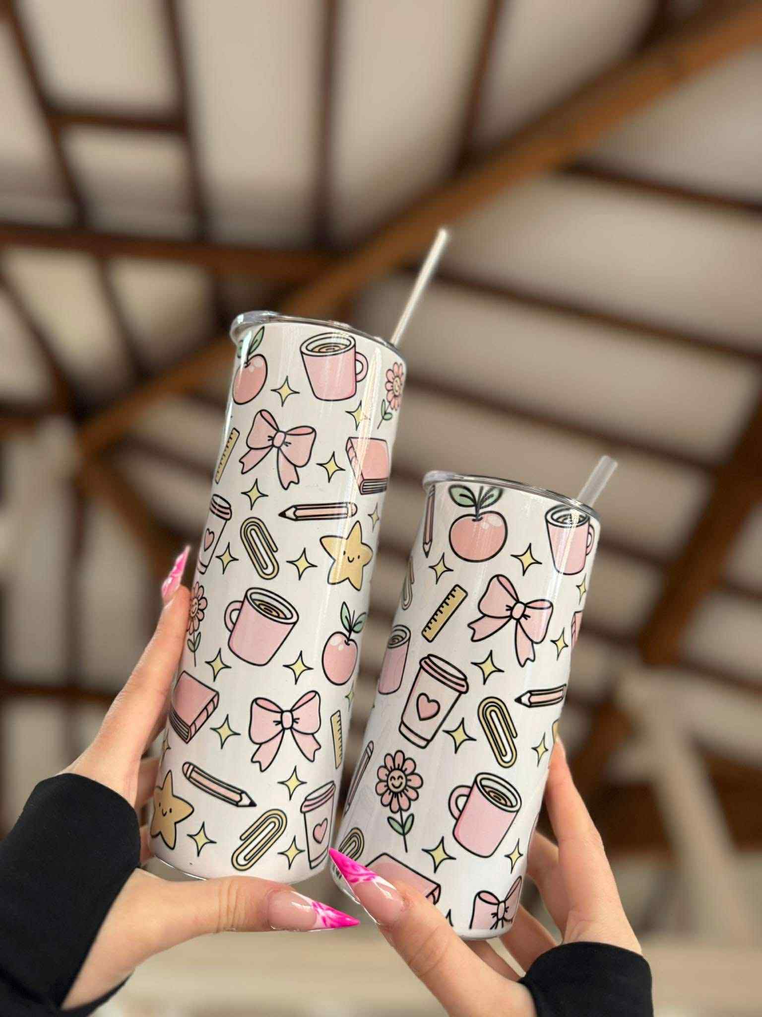 For bookworms and coffee lovers alike! This set includes a 20oz and 15oz tumbler in a soft baby pink, covered in books and coffee cups—perfect for sipping while reading your favourite novel or enjoying a relaxing coffee break.