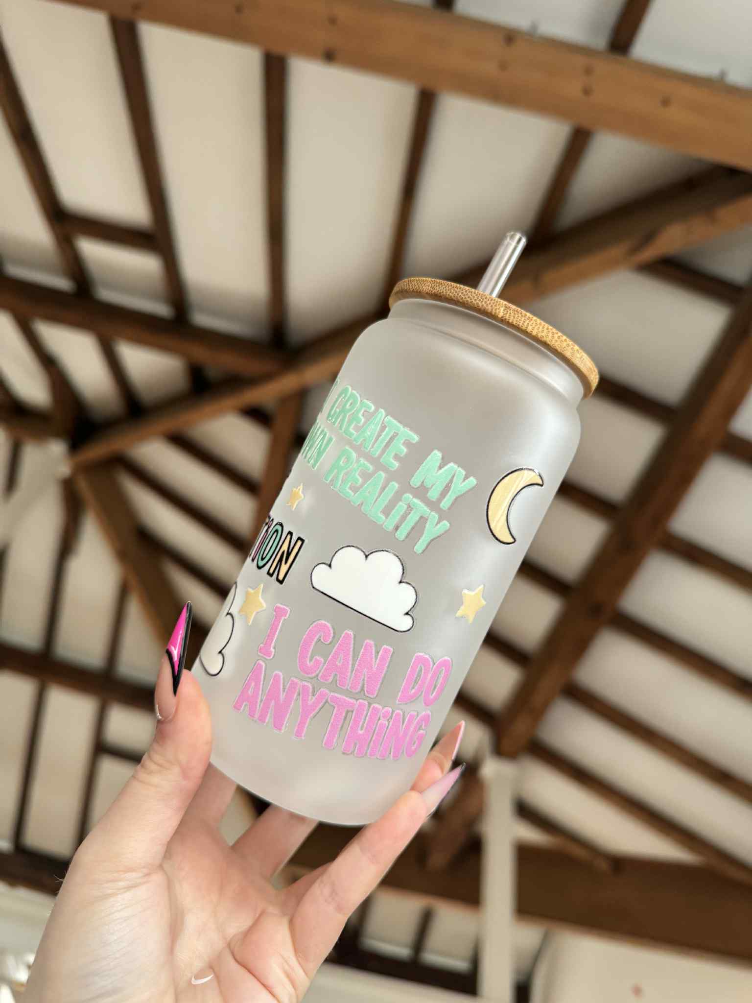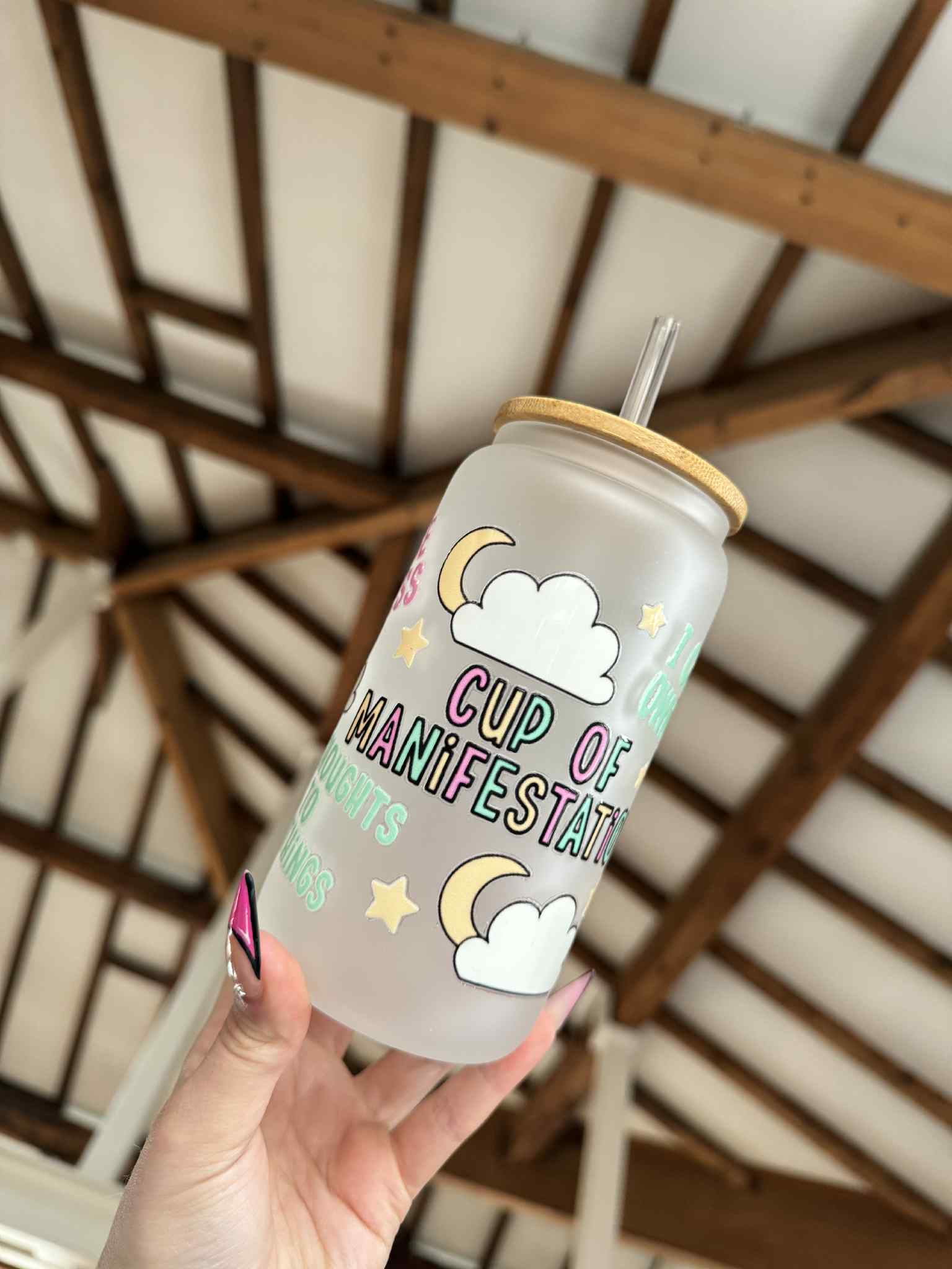 Cup of Manifestation 15oz Frosted Libbey Glass Can – Sip, focus, and manifest your dreams in frosted style! This 15oz frosted Libbey glass can comes with a bamboo lid and straw, perfect for enjoying your favorite drink while calling in all the good vibes. ✨❄️🌿