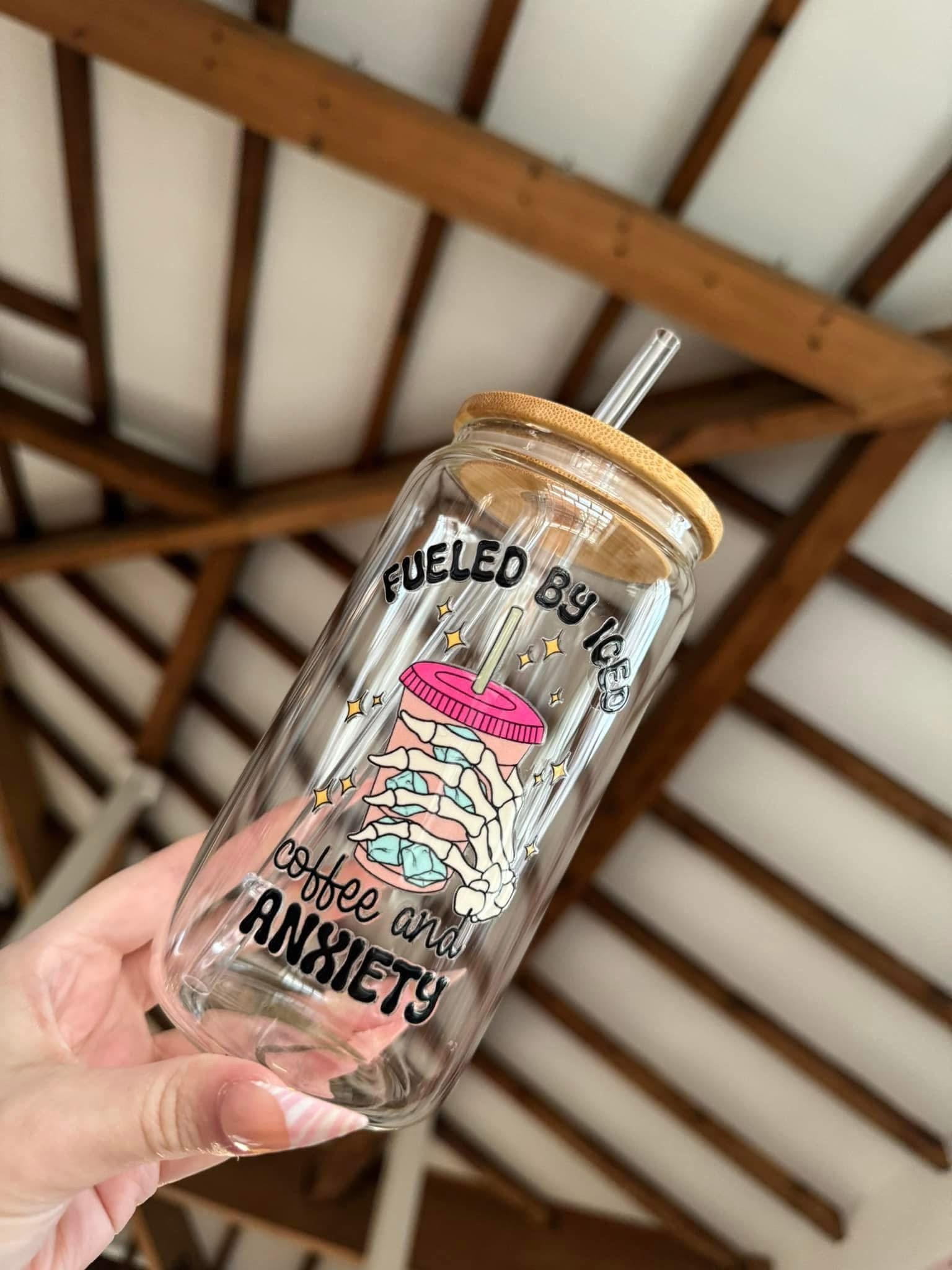 Fuelled by Iced Coffee and Anxiety 15oz Libbey Glass Can – Keep your iced coffee close and your anxiety closer… or at least under control! This 15oz Libbey glass can comes with a bamboo lid and straw, perfect for powering through the day, one sip at a time. ❄️☕💥