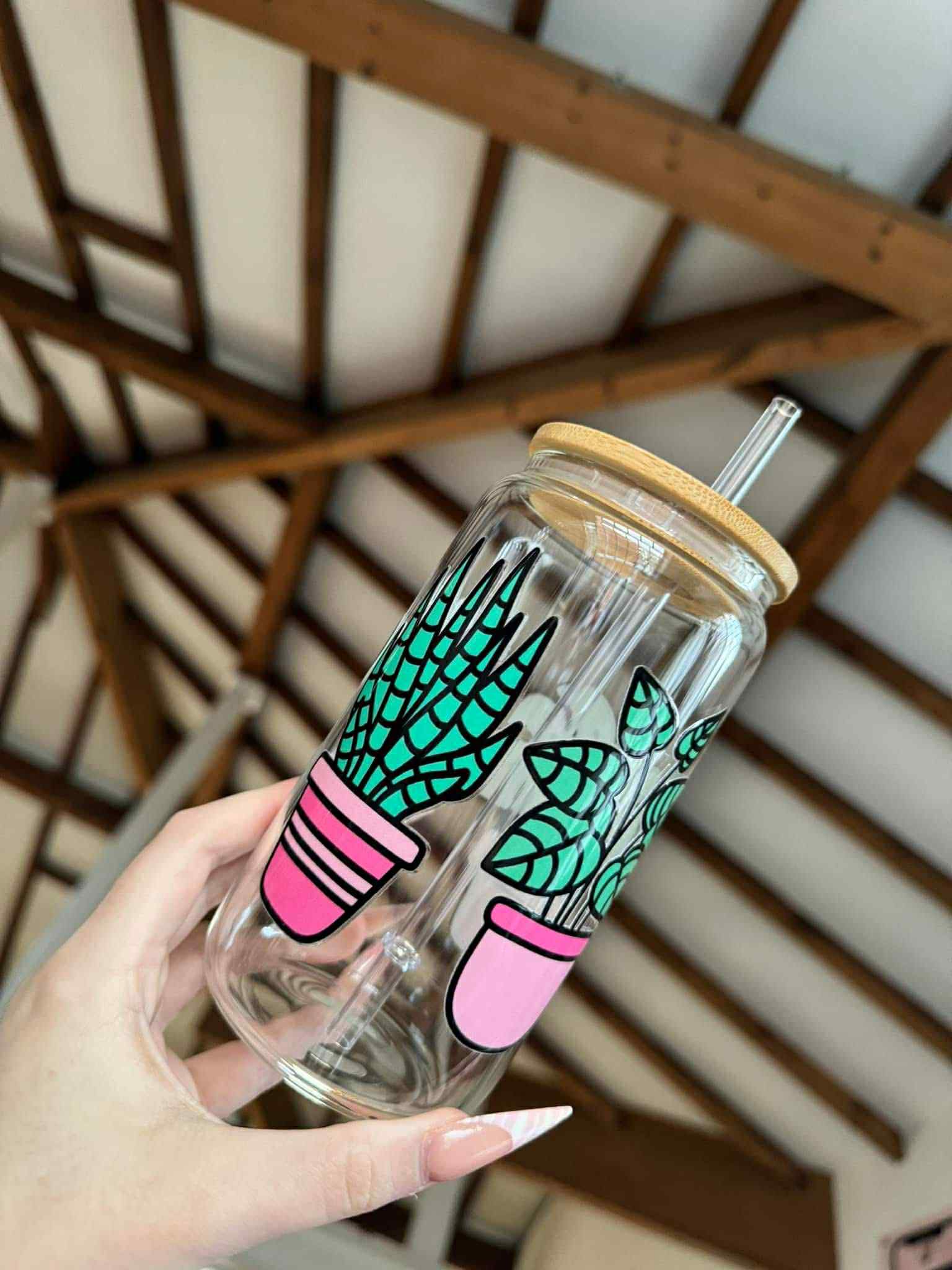 Green Plant, Pink Plant Pot 15oz Libbey Glass Can β For the plant lover who likes a pop of pink! This 15oz Libbey glass can comes with a bamboo lid and straw, perfect for sipping while channeling all the leafy, cute vibes. πΏπβ¨