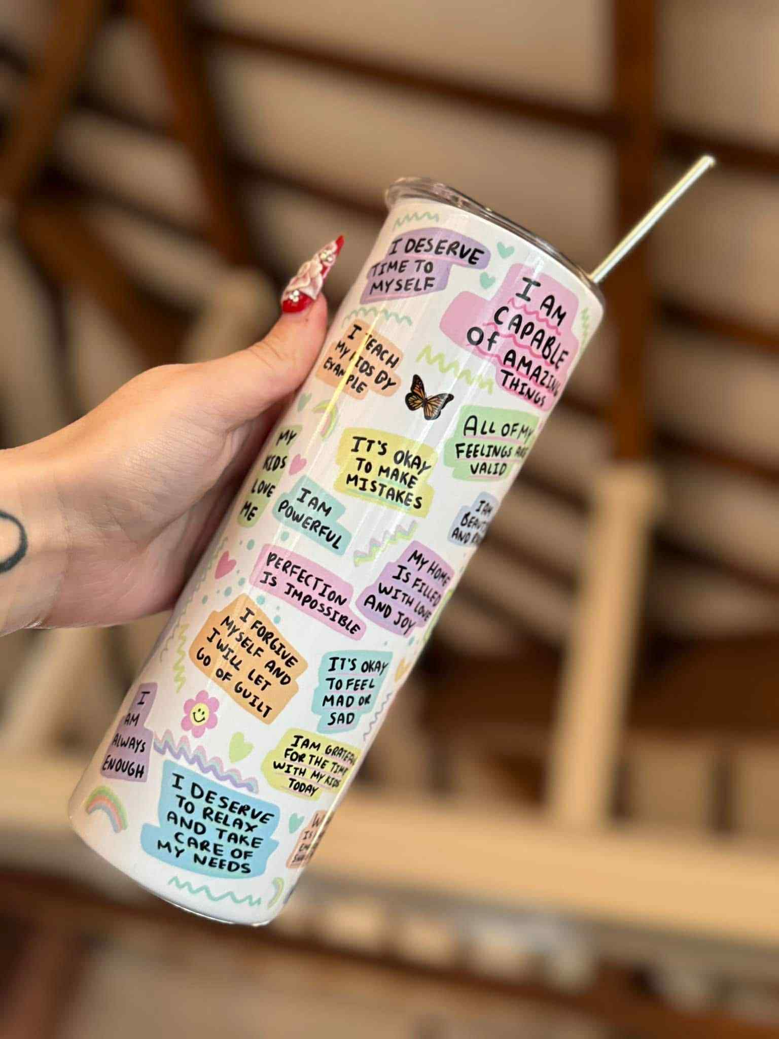 A tumbler that says: Sip, breathe, repeat—self-love starts here. 💕