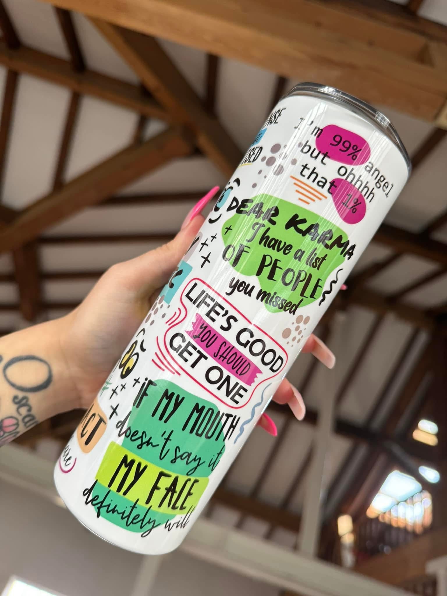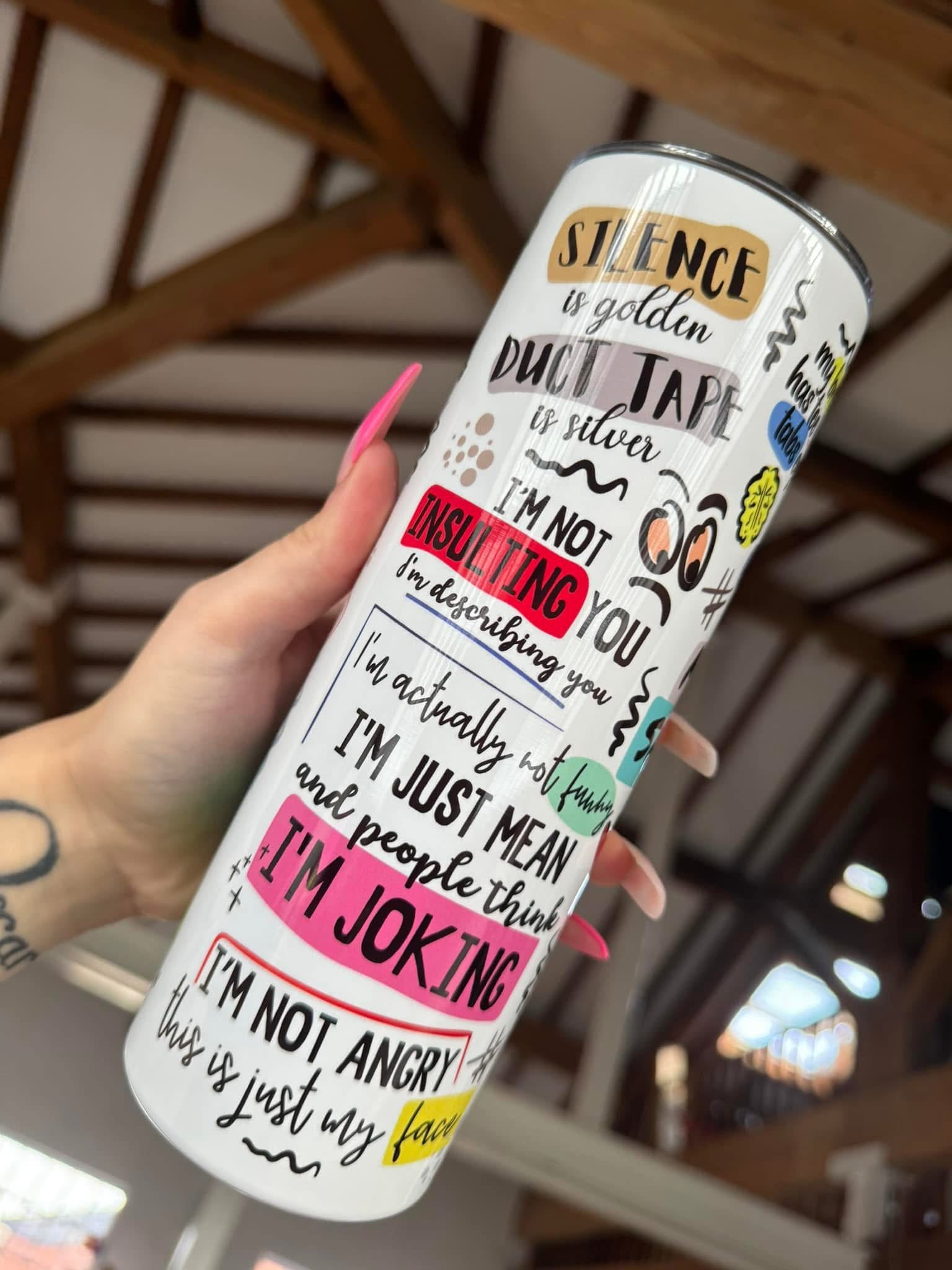 For your daily dose of coffee and attitude! This 20oz tumbler is perfect for sipping your favourite beverage while serving up a side of sarcasm. Whether itβs morning coffee, tea, or iced drinks, embrace your witty side with every sip.