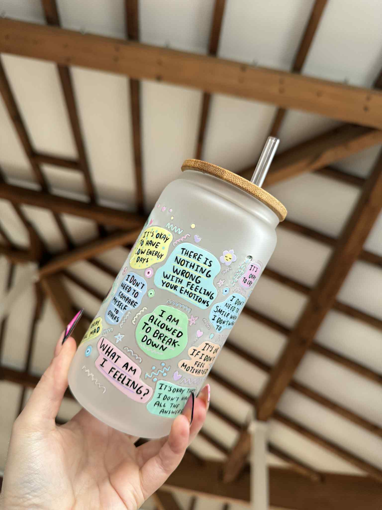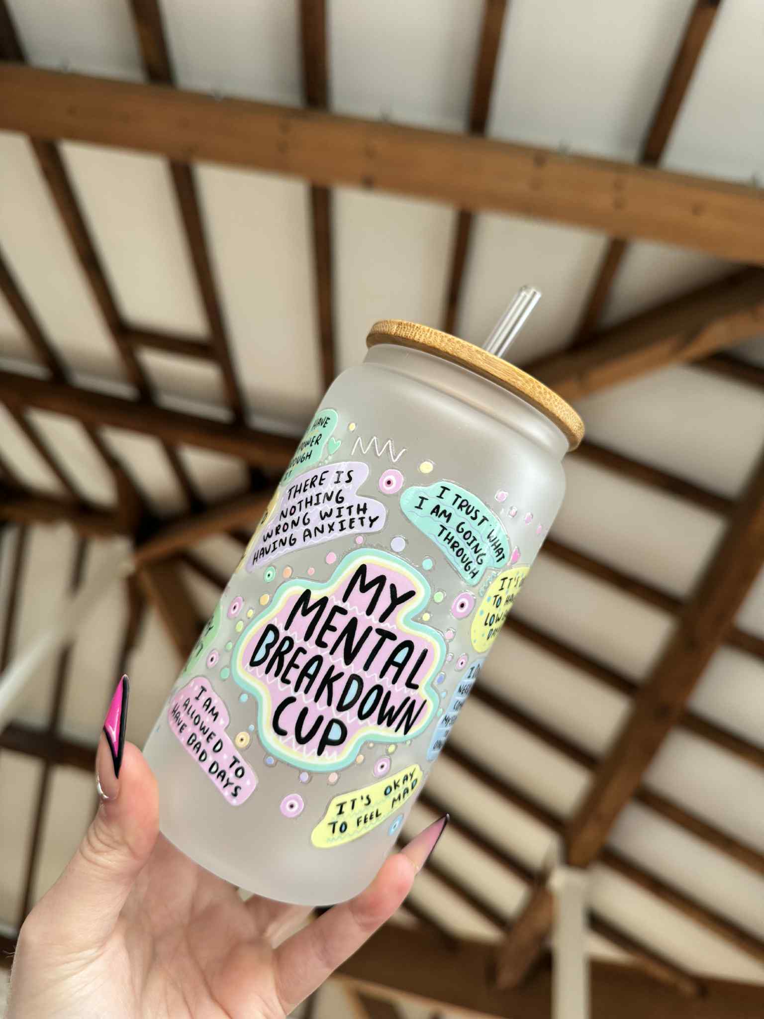 My Mental Breakdown Cup 15oz Frosted Libbey Glass Can – Sip, breathe, and survive the chaos in style! This 15oz frosted Libbey glass can comes with a bamboo lid and straw, perfect for powering through your day with a little humor and a lot of frosted vibes. ❄️💥✨