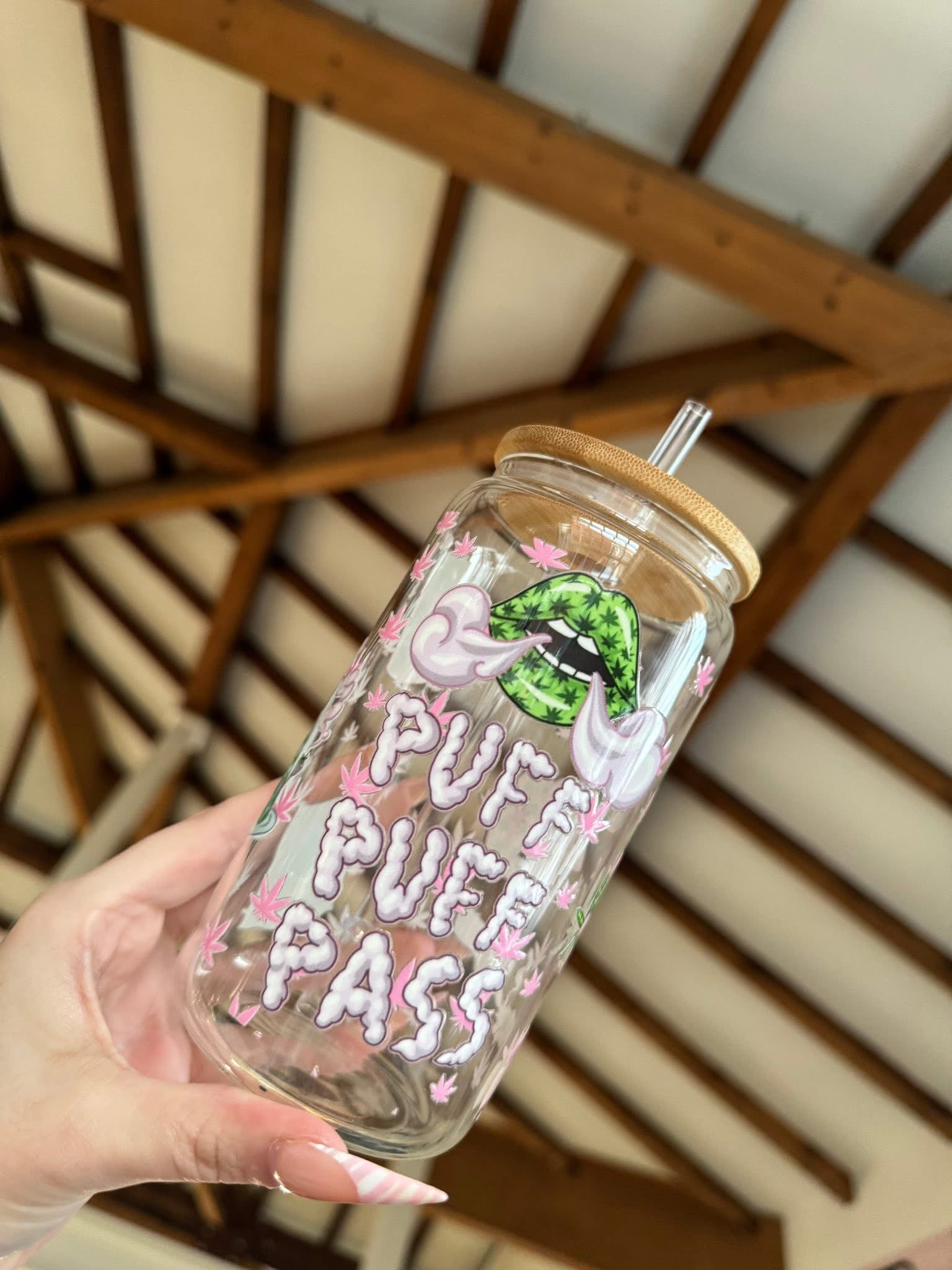 Puff Puff Pass 15oz Libbey Glass Can β Sip, relax, and keep the good vibes rolling! This 15oz Libbey glass can comes with a bamboo lid and straw, perfect for chilling with your favorite drink and passing on the positivity. πΏπ¨β¨