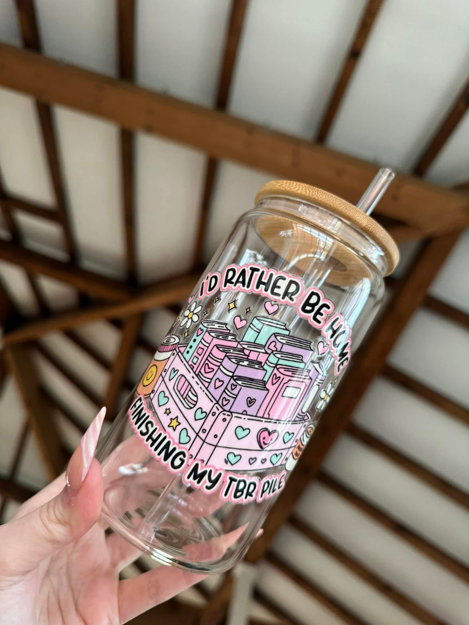 Rather Be Home Finishing My TBR Pile 15oz Libbey Glass Can – Cozy up with your next read and sip in style! This 15oz Libbey glass can comes with a bamboo lid and straw, perfect for long reading sessions and staying snug while tackling that TBR pile. 📚✨