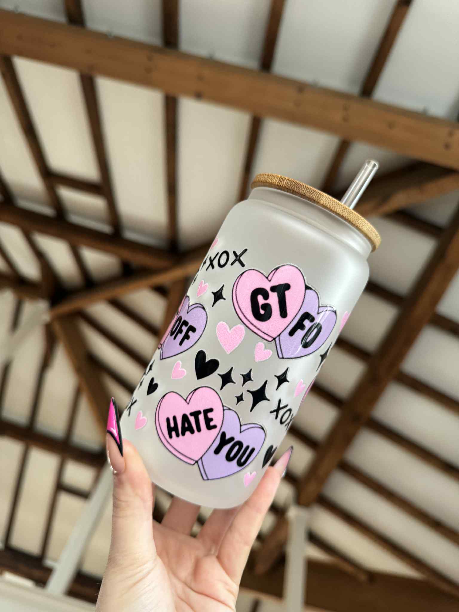 Pink and Purple Rude Vibes 15oz Frosted Libbey Glass Can – Sweet, sassy, and unapologetically frosted! This 15oz frosted Libbey glass can comes with a bamboo lid and straw, perfect for sipping while serving all the pink and purple rude energy. 💖💜❄️