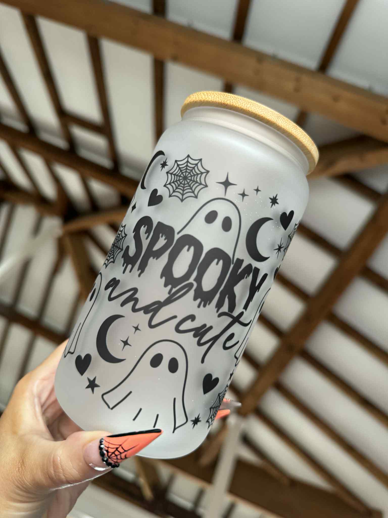 Spooky and Cute 15oz Frosted Libbey Glass Can – Boo-tifully frosted and full of charm! This 15oz frosted Libbey glass can comes with a bamboo lid and straw, perfect for sipping your favorite drink while embracing all the spooky yet cute vibes. 👻💖❄️