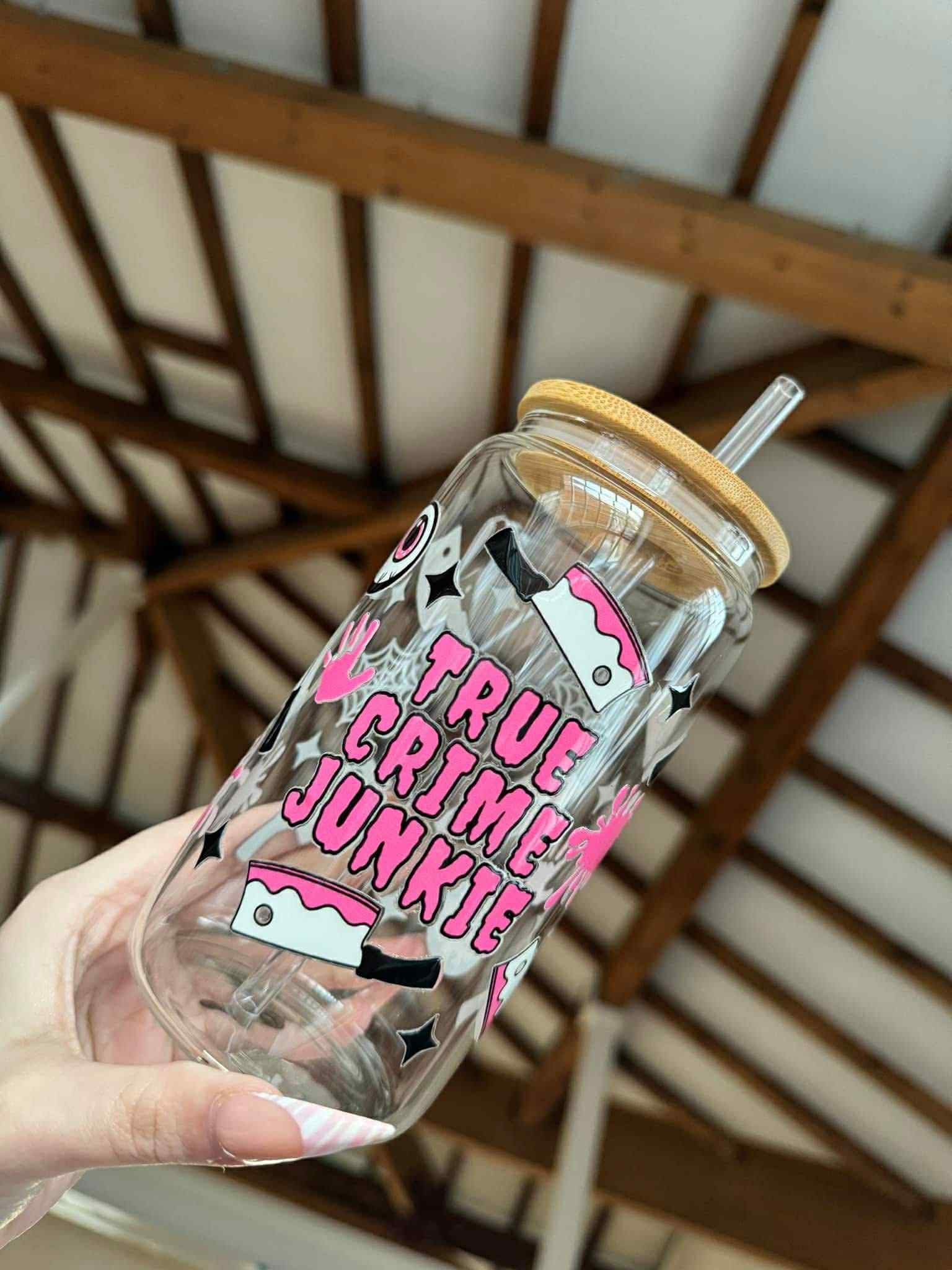 True Crime Junkie 15oz Libbey Glass Can – Sip your way through suspense! This 15oz Libbey glass can comes with a bamboo lid and straw, perfect for enjoying your favorite drink while bingeing all the true crime tales you can handle. 🕵️♀️🔍✨